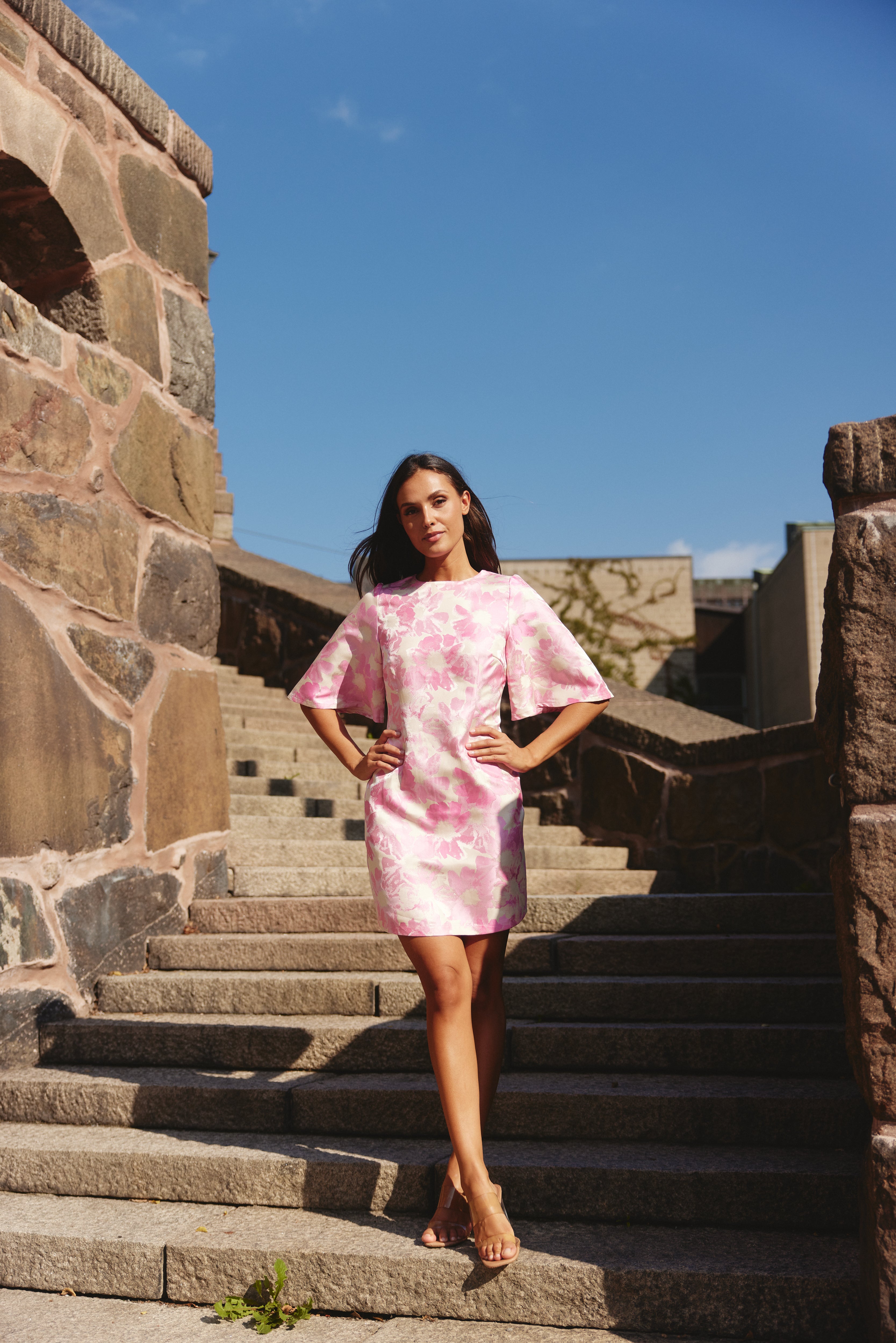 A vibrant pink floral mini dress with a soft sheen, featuring flutter sleeves and a straight, feminine silhouette. The smooth woven fabric and hidden back zip create a polished, elegant look.