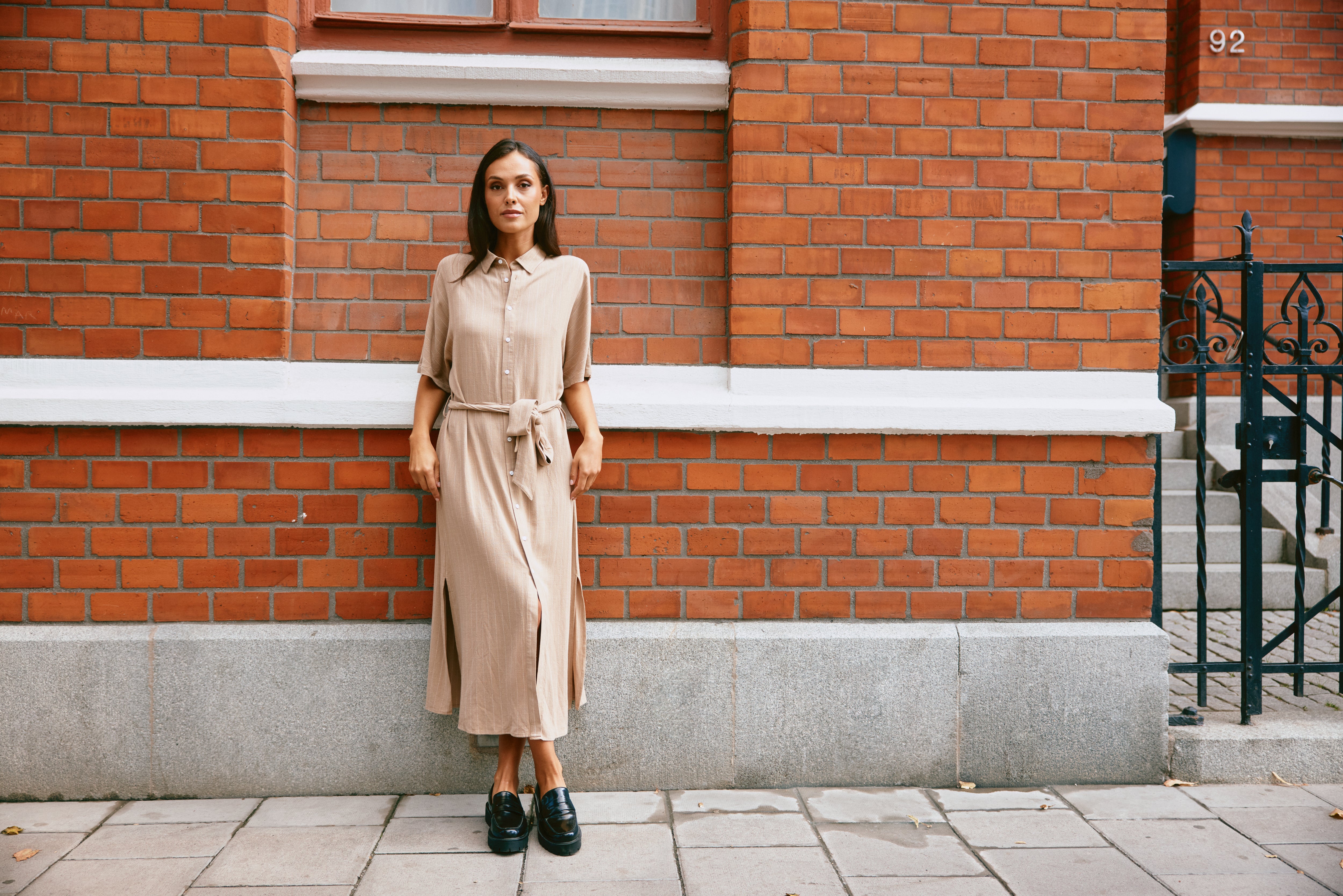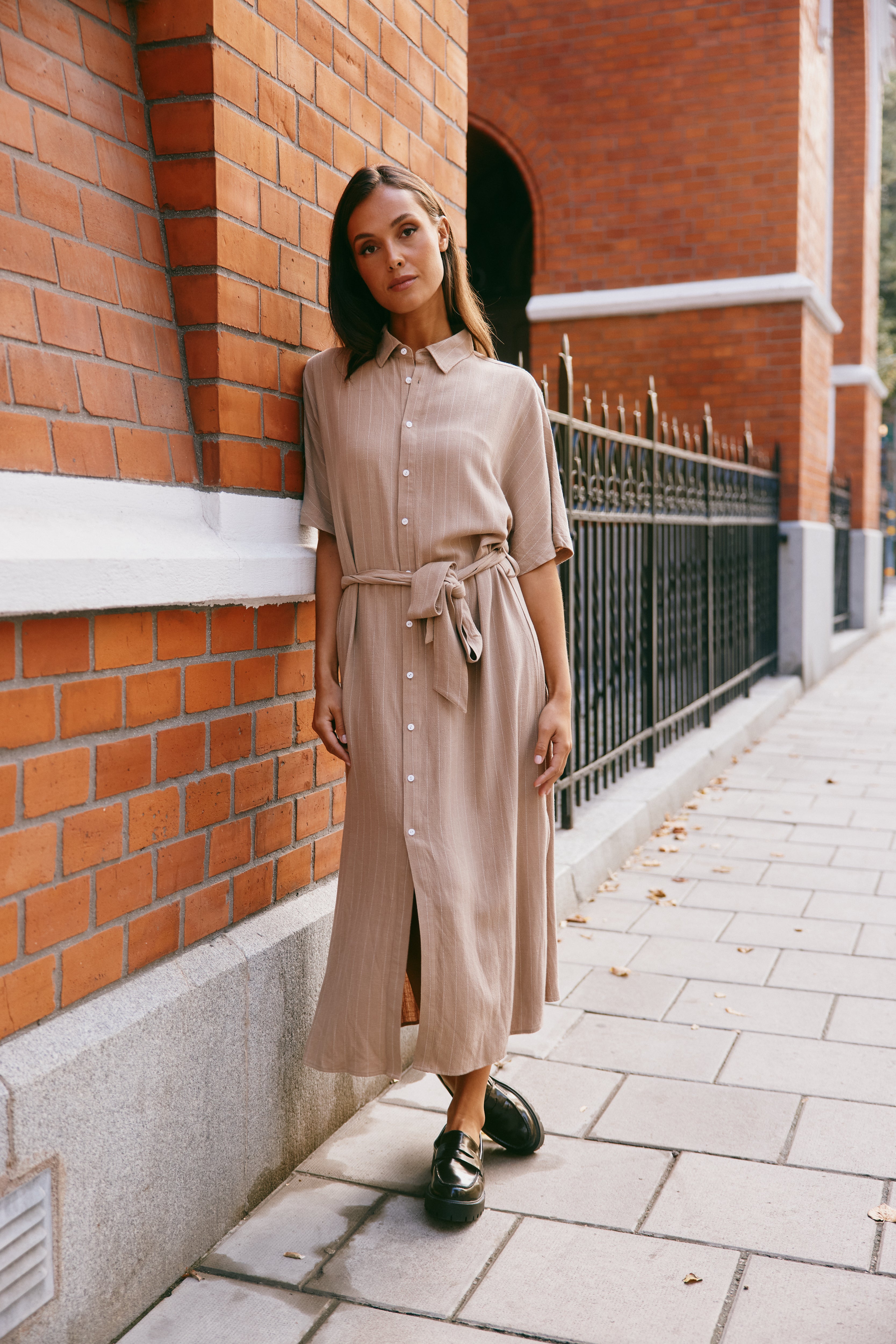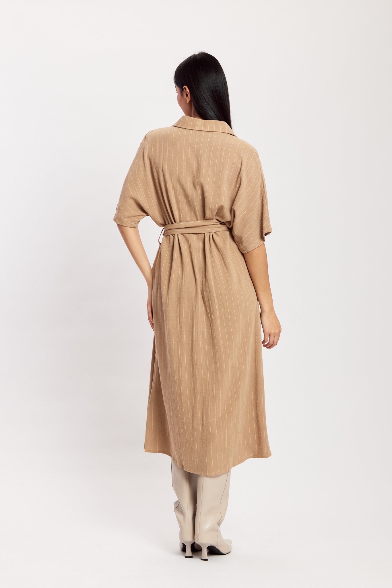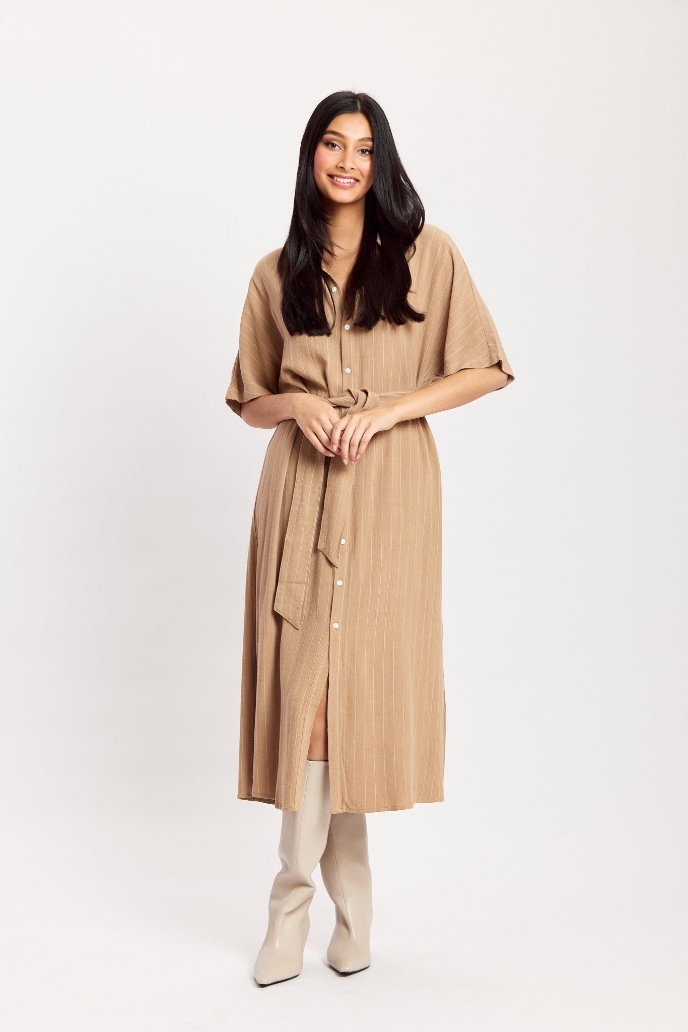 A midi shirt dress featuring short sleeves, a full button-down front, and a matching waist tie for a flattering fit. Made in a soft, textured fabric that drapes beautifully. Elegant, easy to style, and perfect for everyday wear.