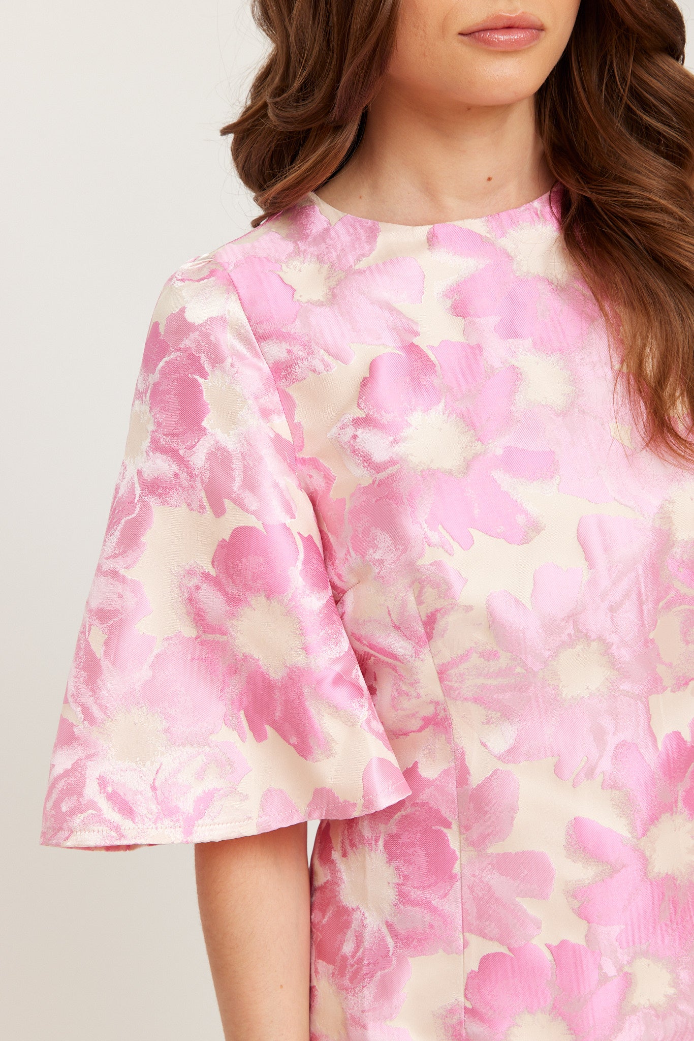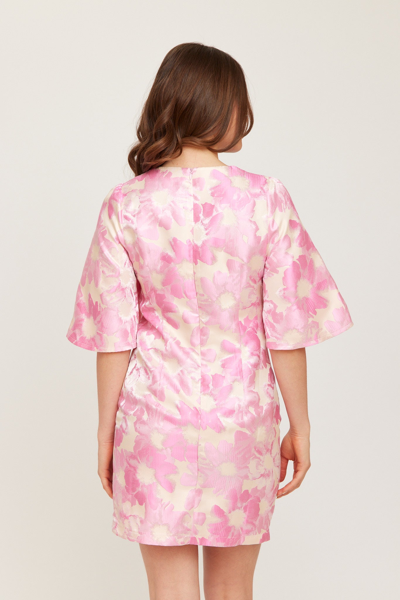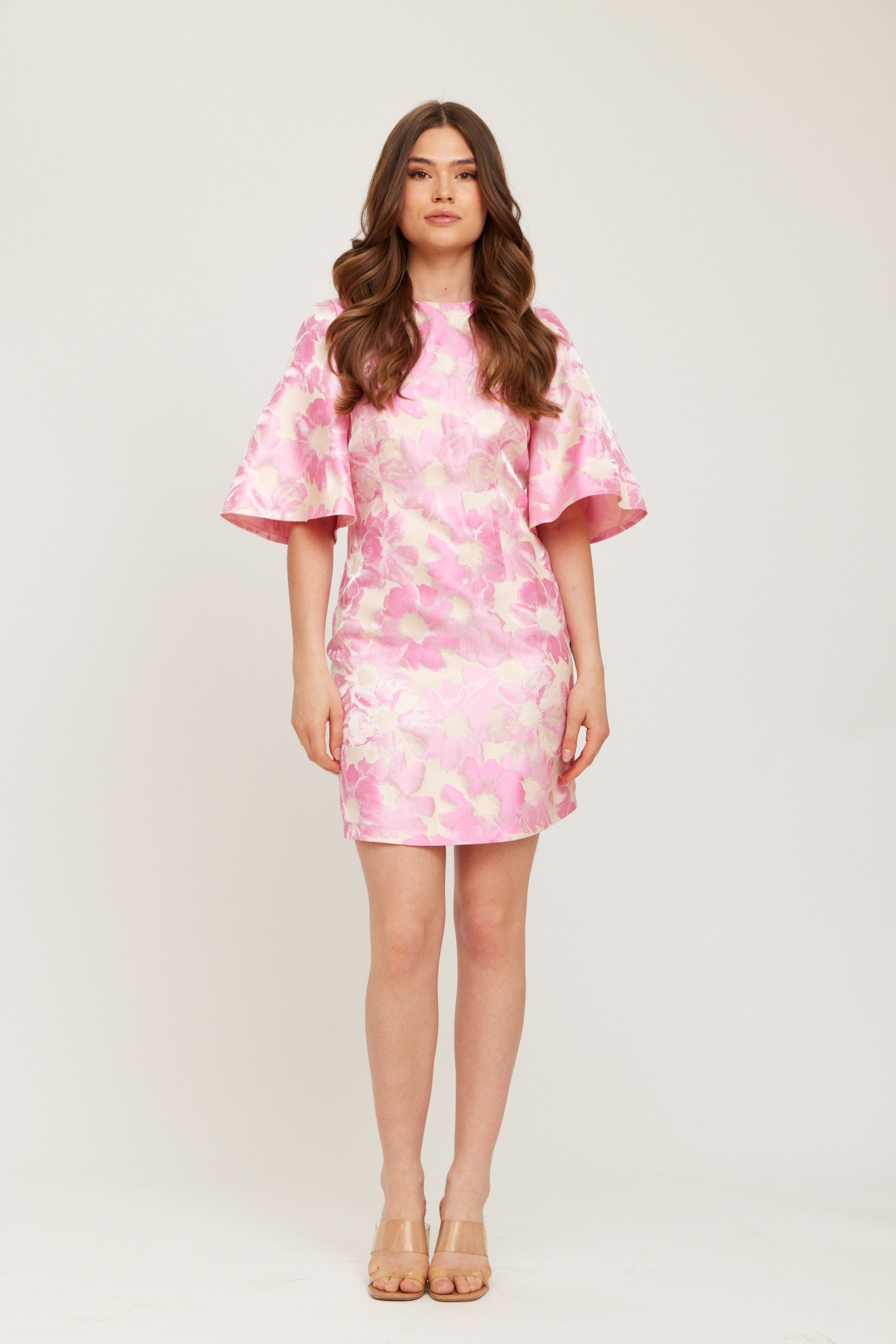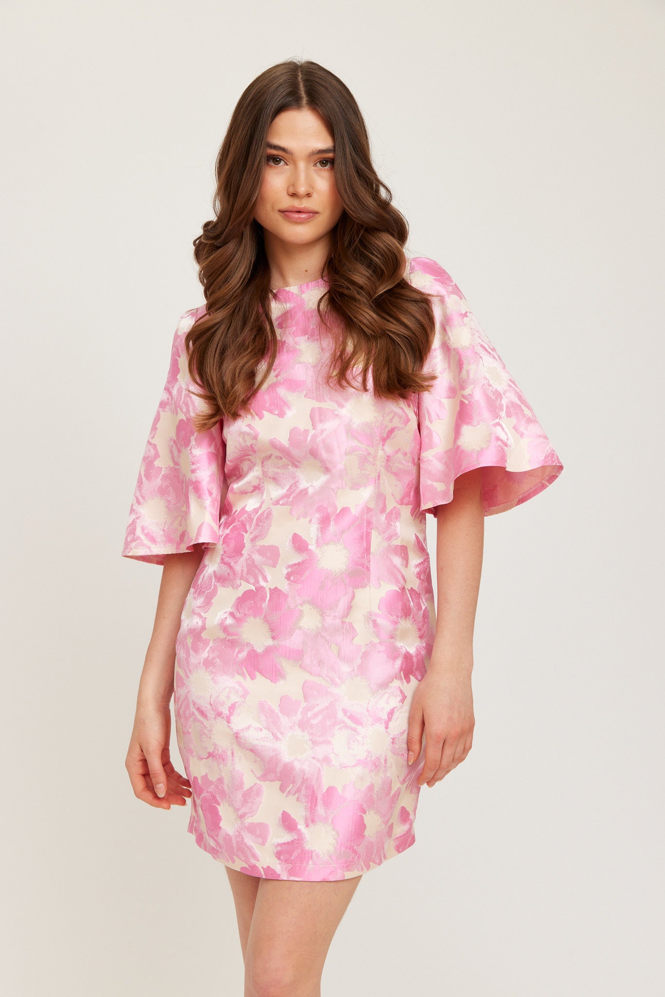 A vibrant pink floral mini dress with a soft sheen, featuring flutter sleeves and a straight, feminine silhouette. The smooth woven fabric and hidden back zip create a polished, elegant look.
