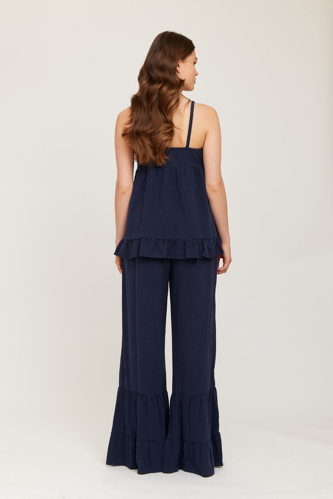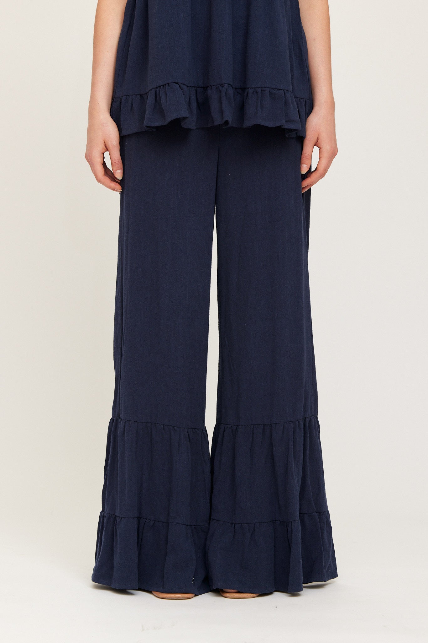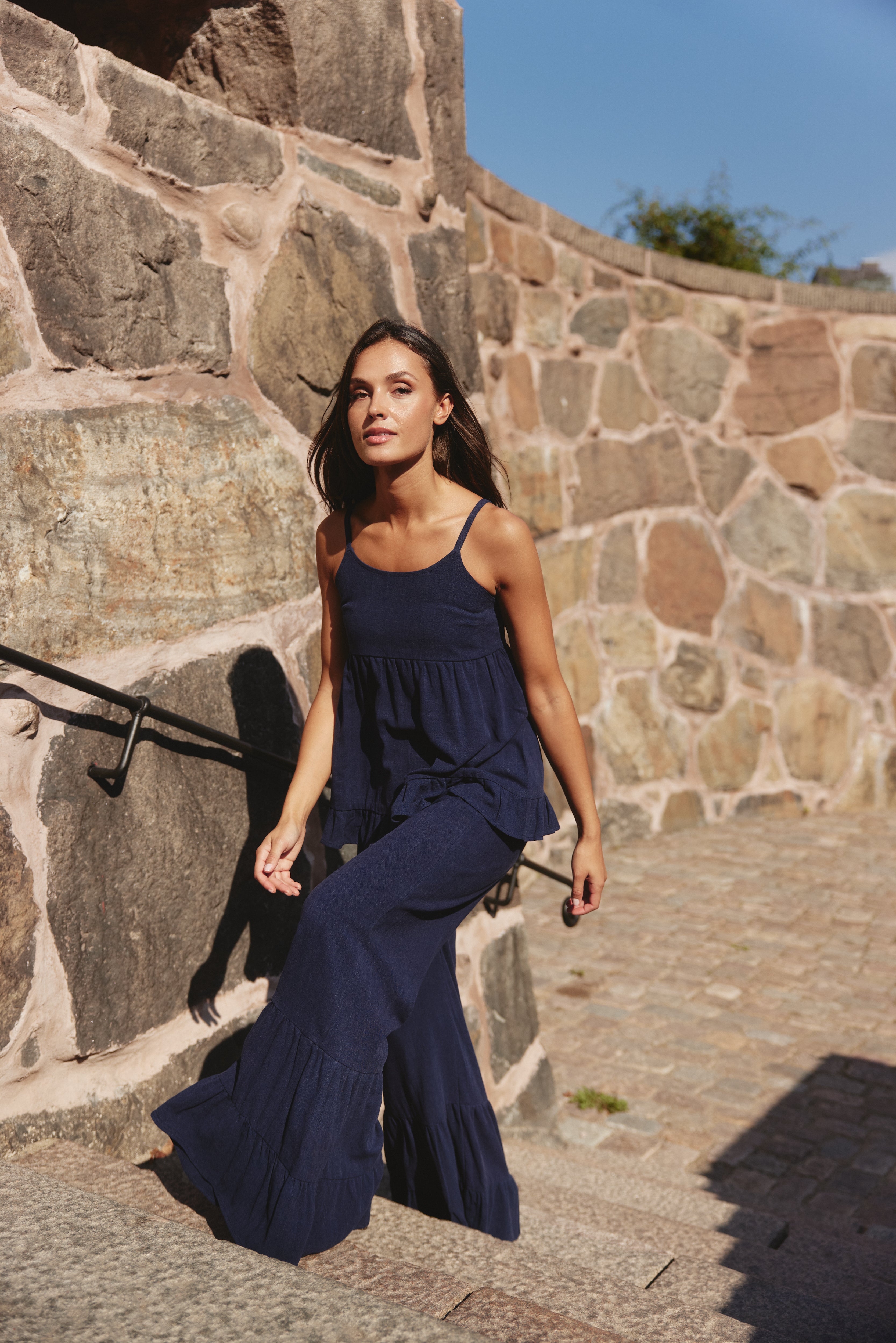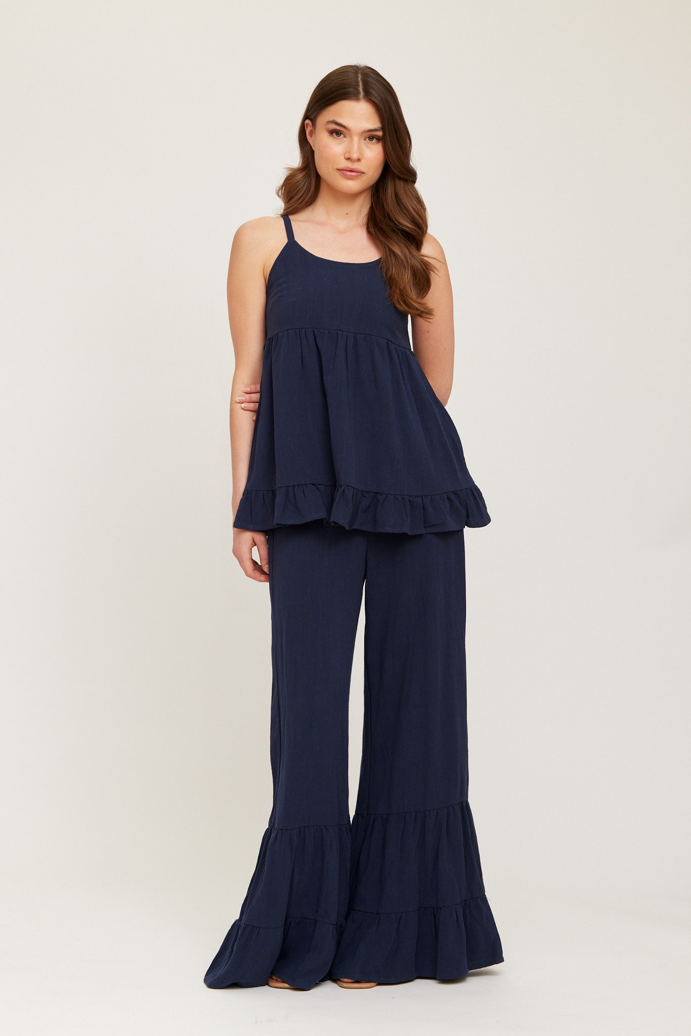 Flowy navy trousers with a relaxed wide-leg fit, featuring soft tiered panels for extra movement and volume. Comfortable, lightweight, and perfect for a breezy, effortless look. Suitable to pair with the matching top or wear on their own.