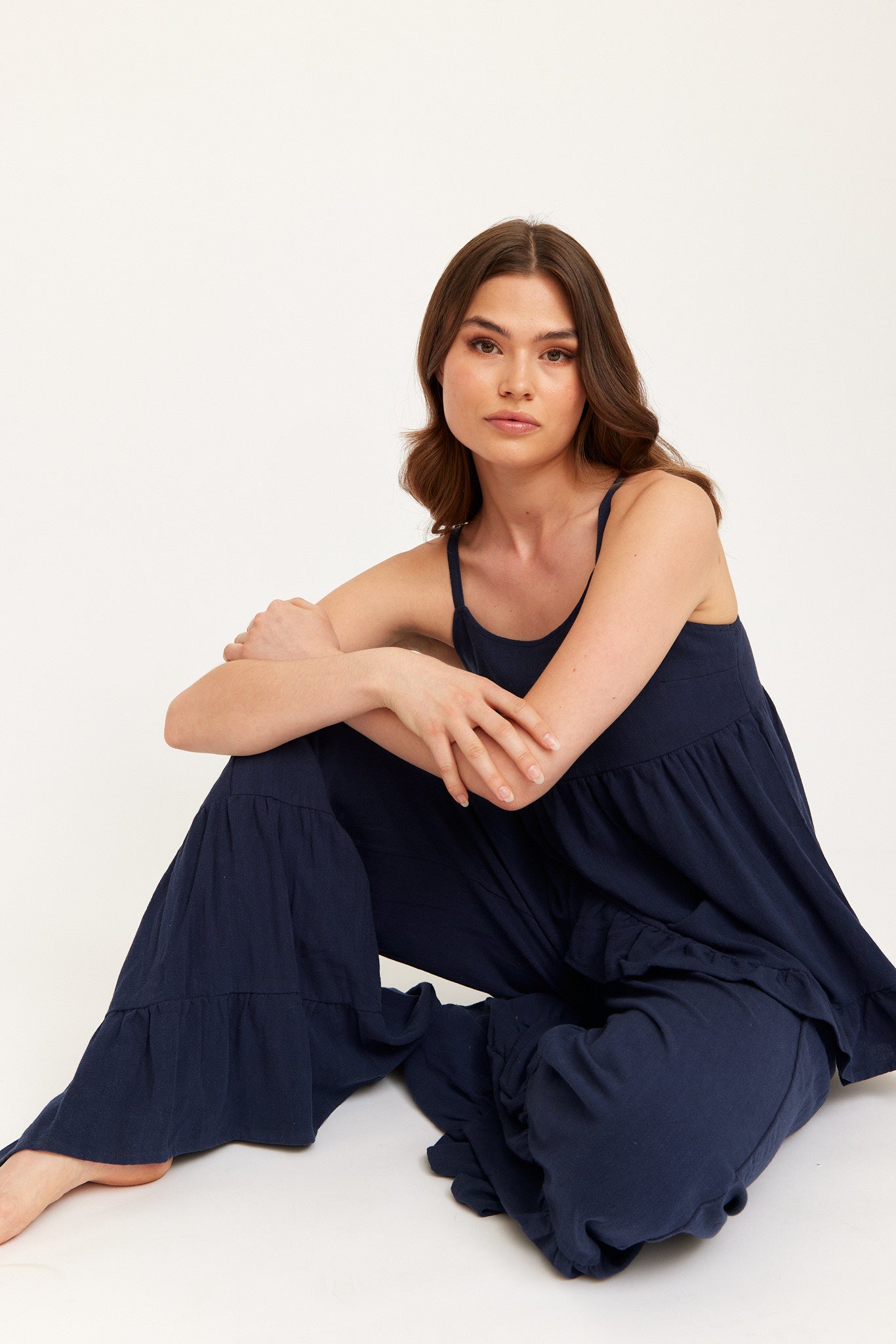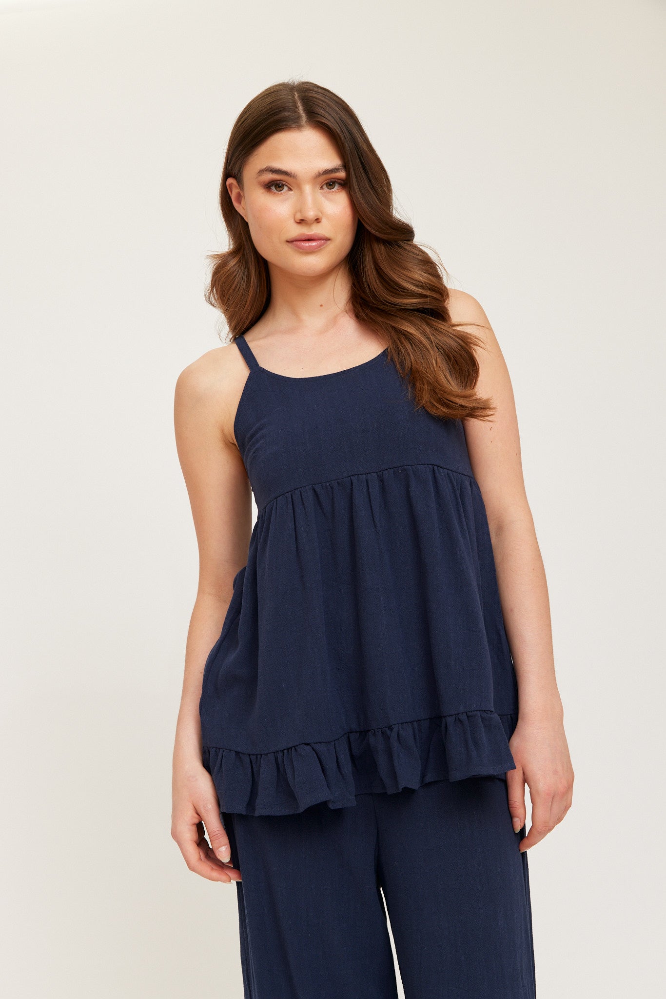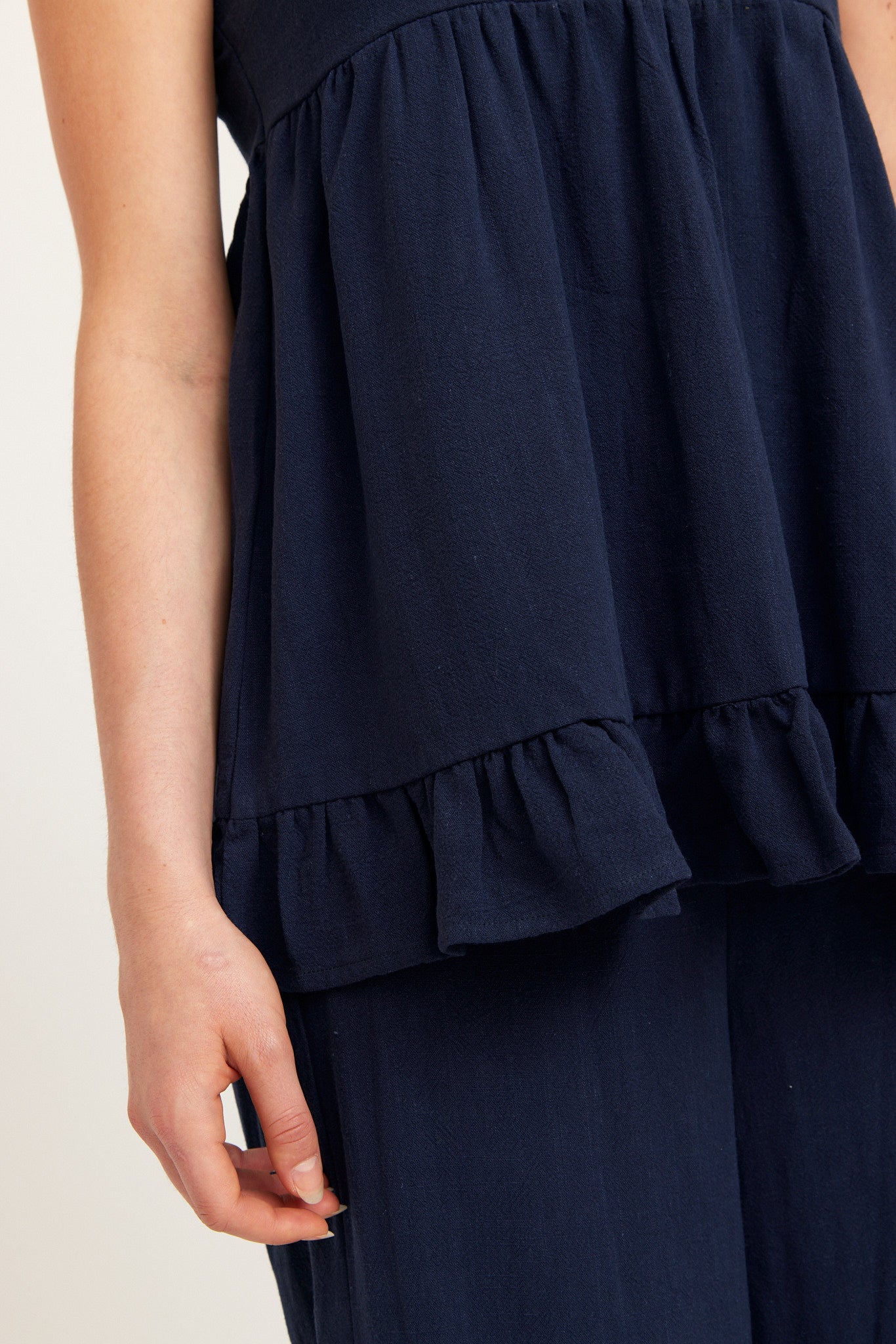 Navy sleeveless top with thin straps, a relaxed A-line fit and a tiered ruffle hem - lightweight and easy for warm days.