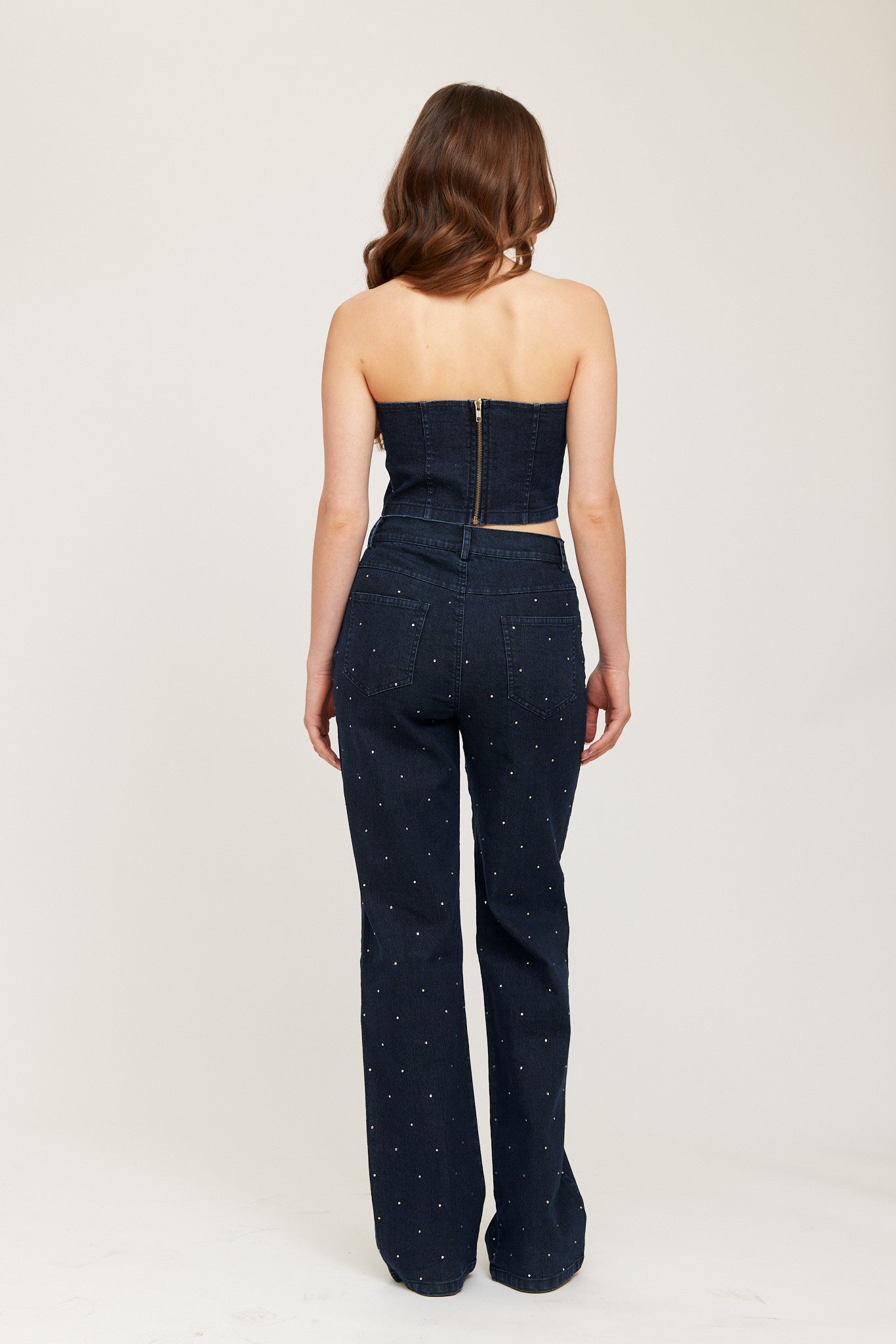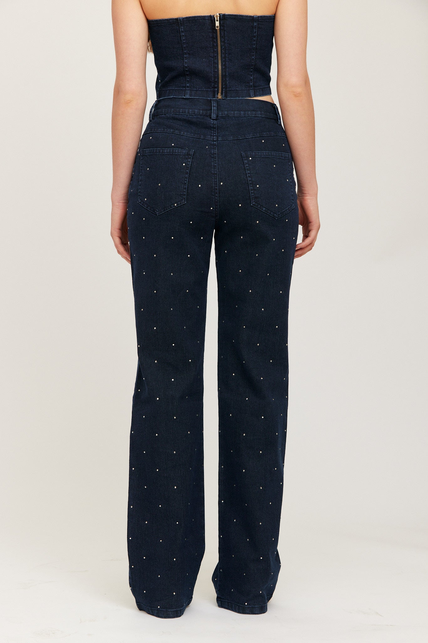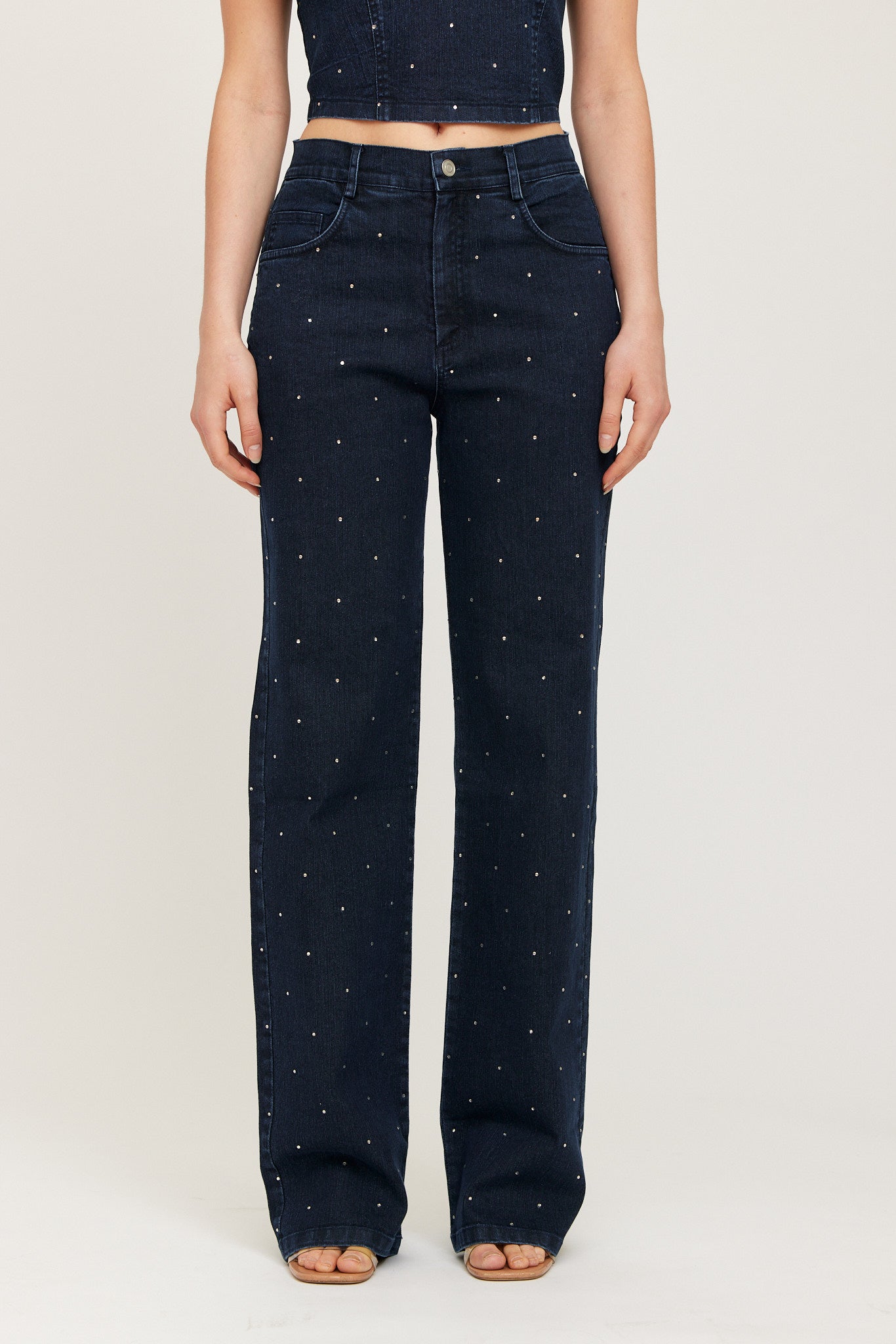 Elegant straight-leg jeans embellished with subtle strass details for sparkling, elevated look. Crafted from a soft denim blend with a flattering mid-rise waist and classic five-pocket design. Perfect for both casual and dressed-up outfits.
