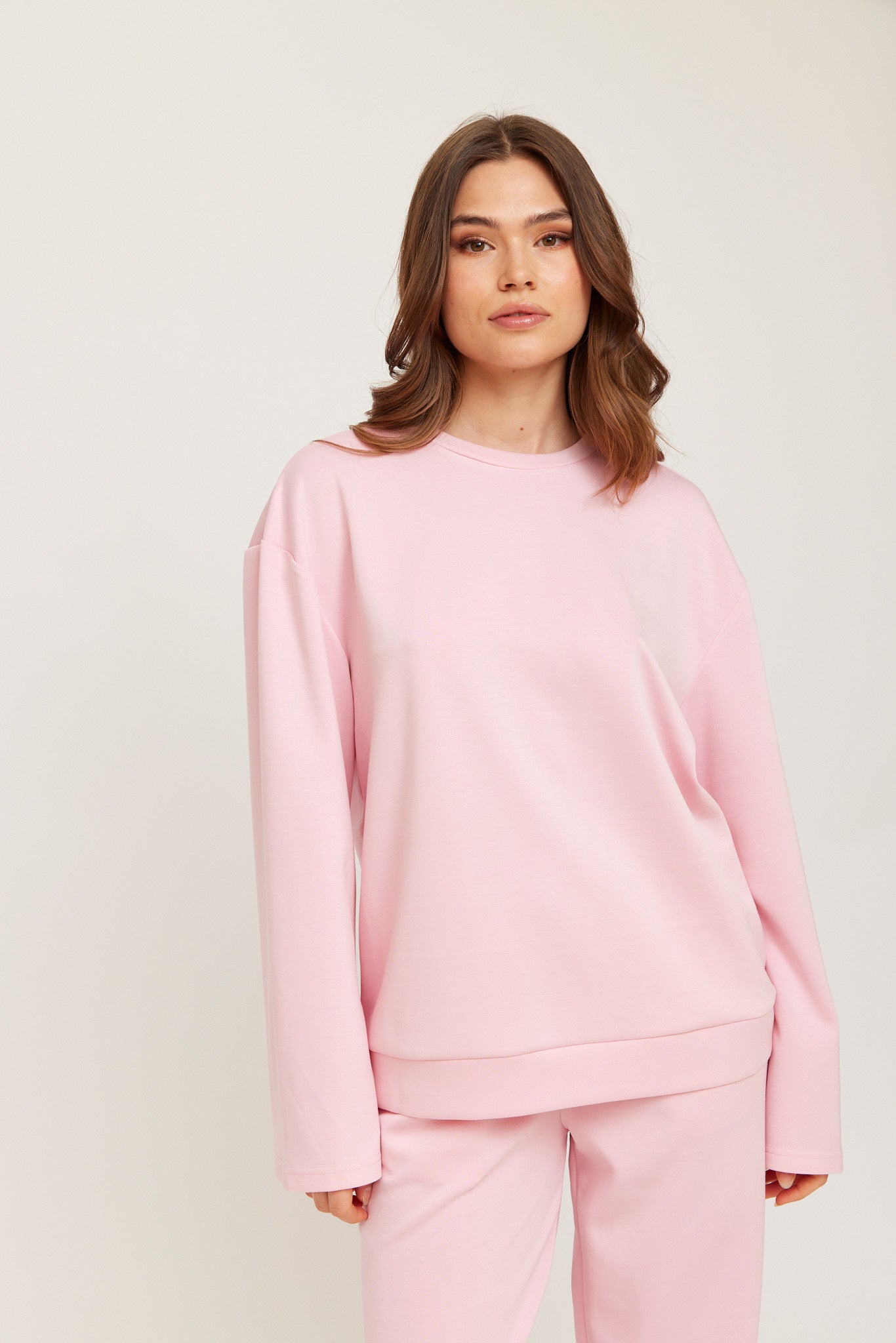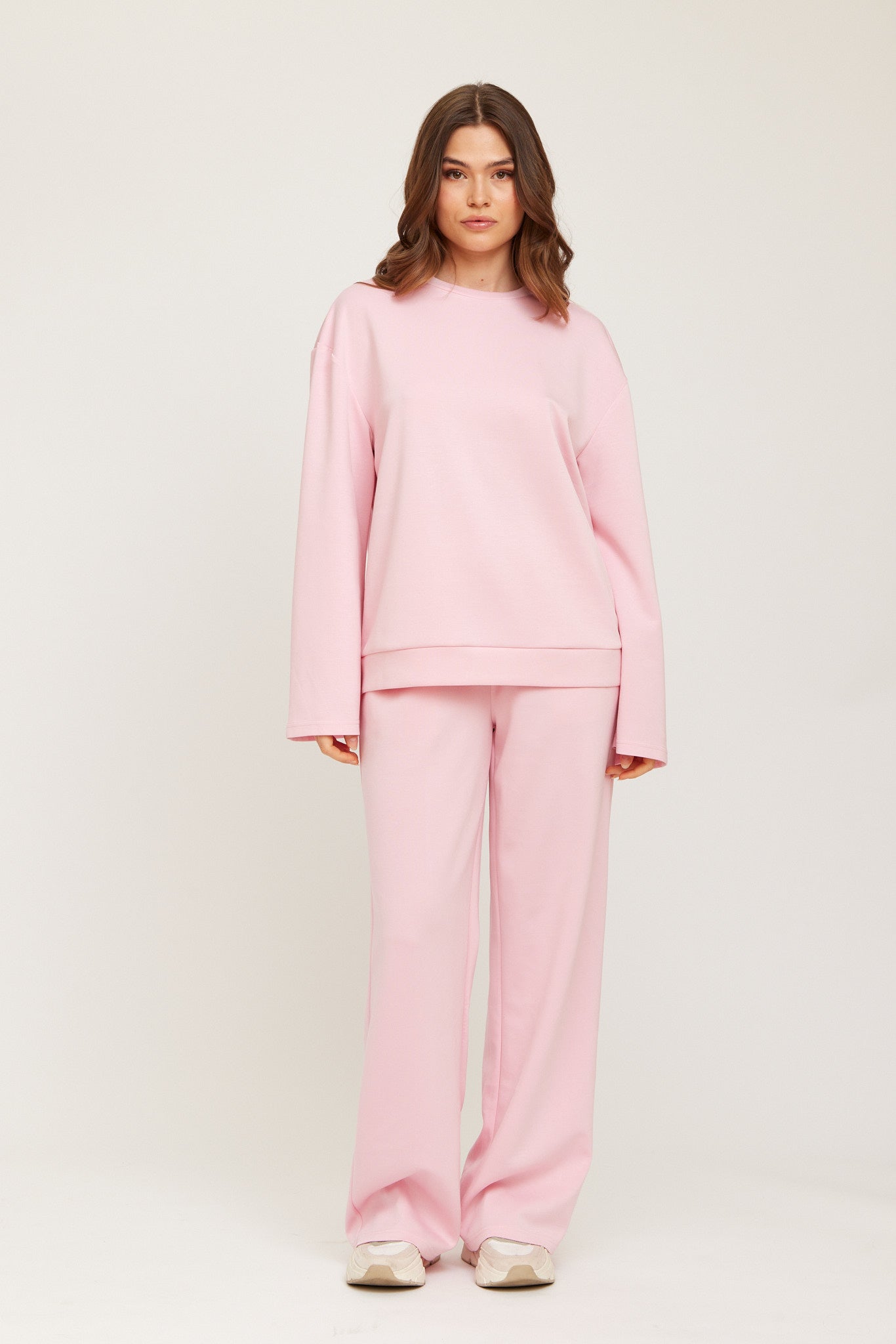 A soft, relaxed-fit sweater made from a smooth, comfortable fabric. Designed with wide sleeves, a straight silhouette, and a clean, minimal look. Perfect for everyday wear or pairing with matching pants for a coordinated set.