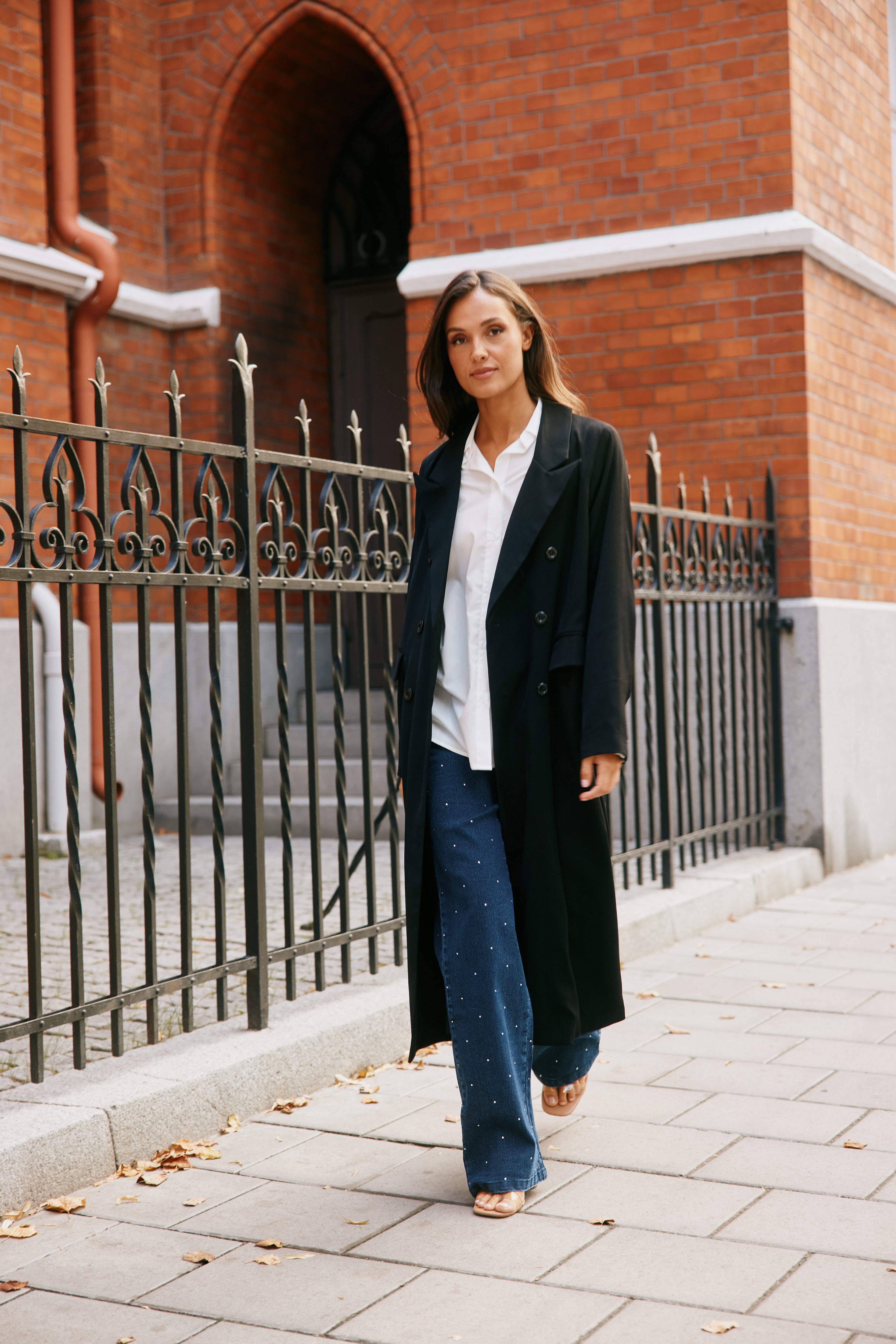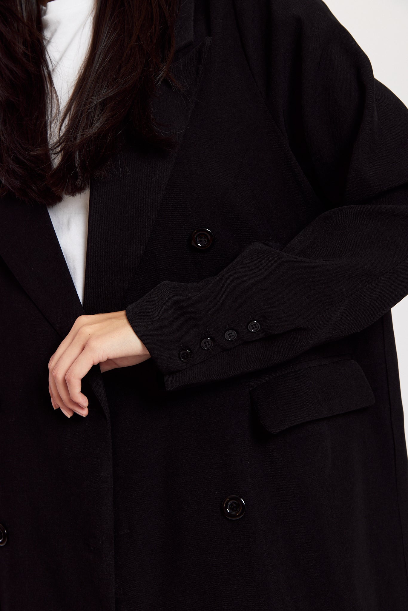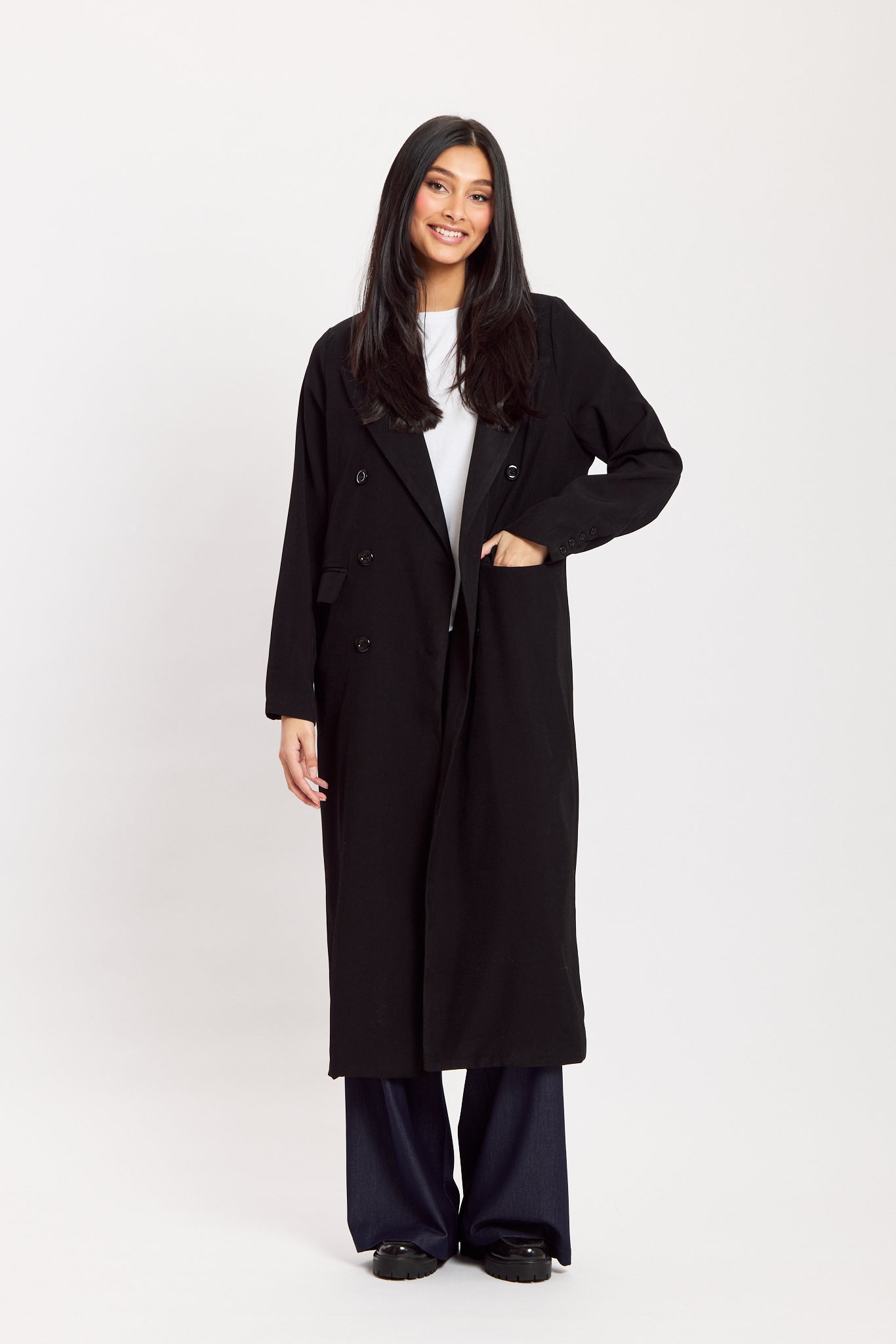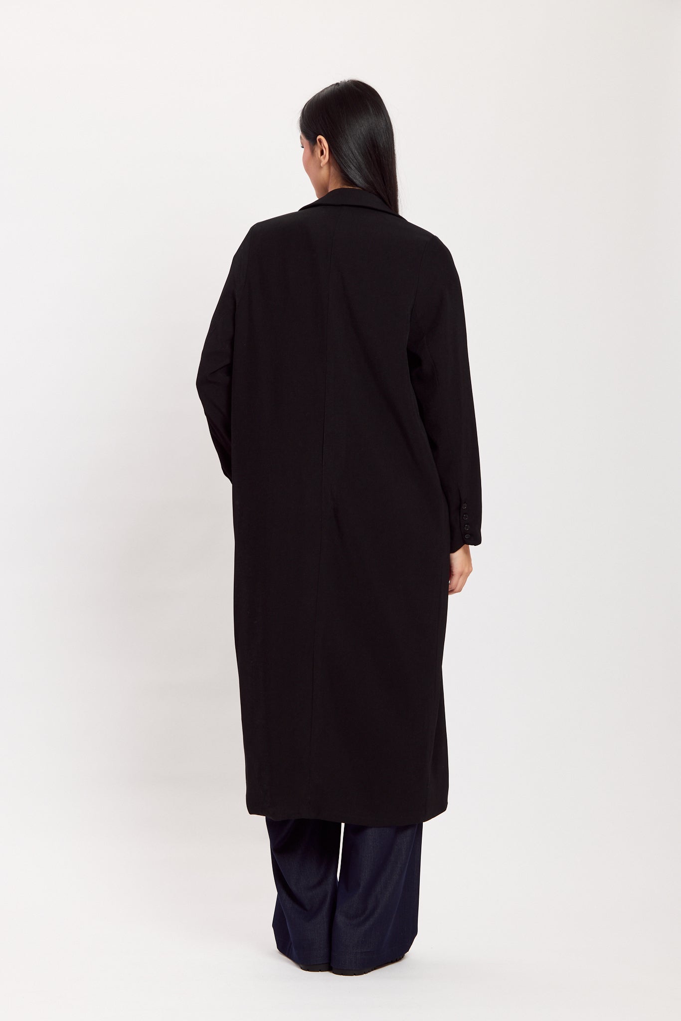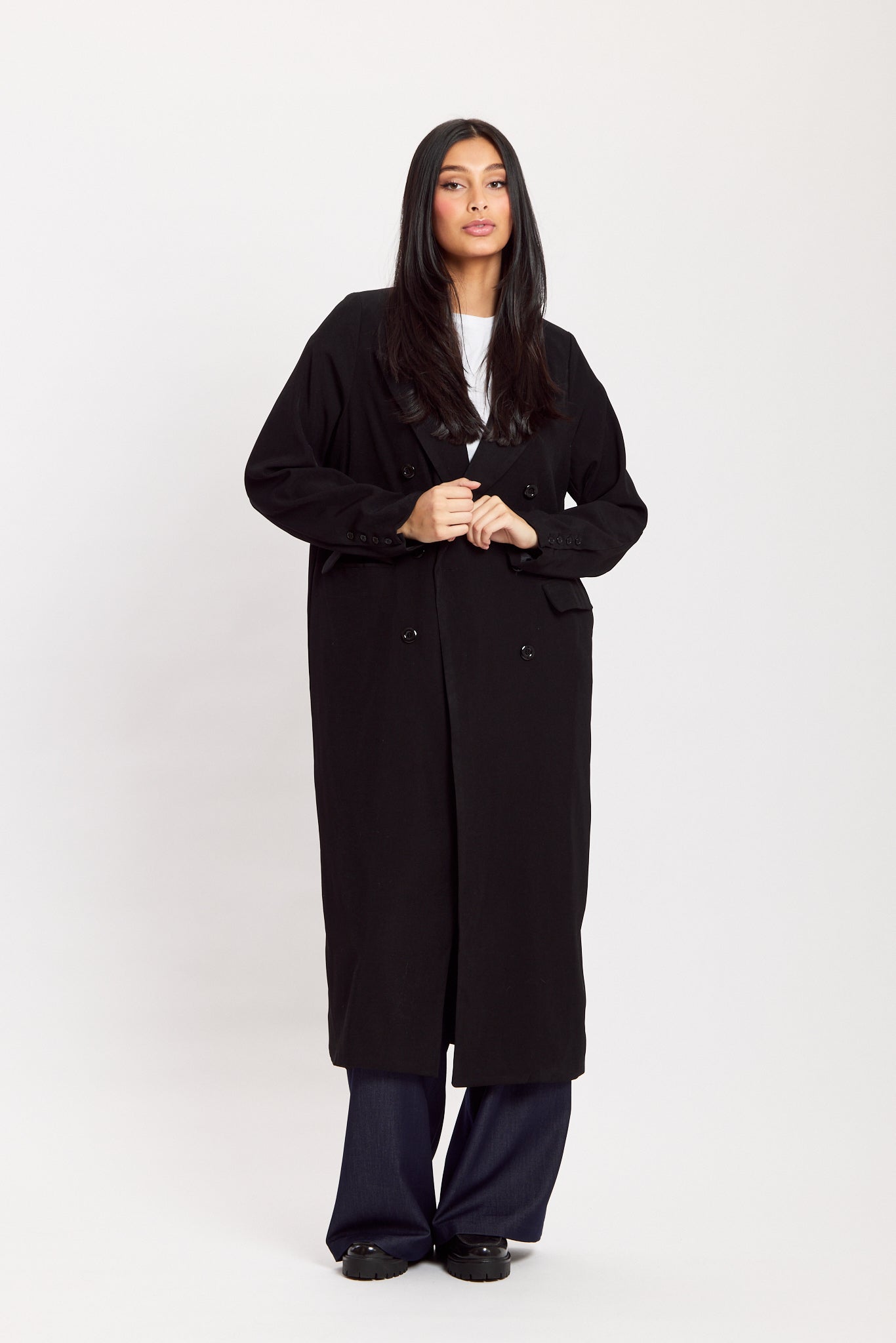 Long tailored black coat featuring a double-breasted front, classic lapels, and a relaxed, elegant fit. Perfect for layering over both casual and dressed-up outfits.