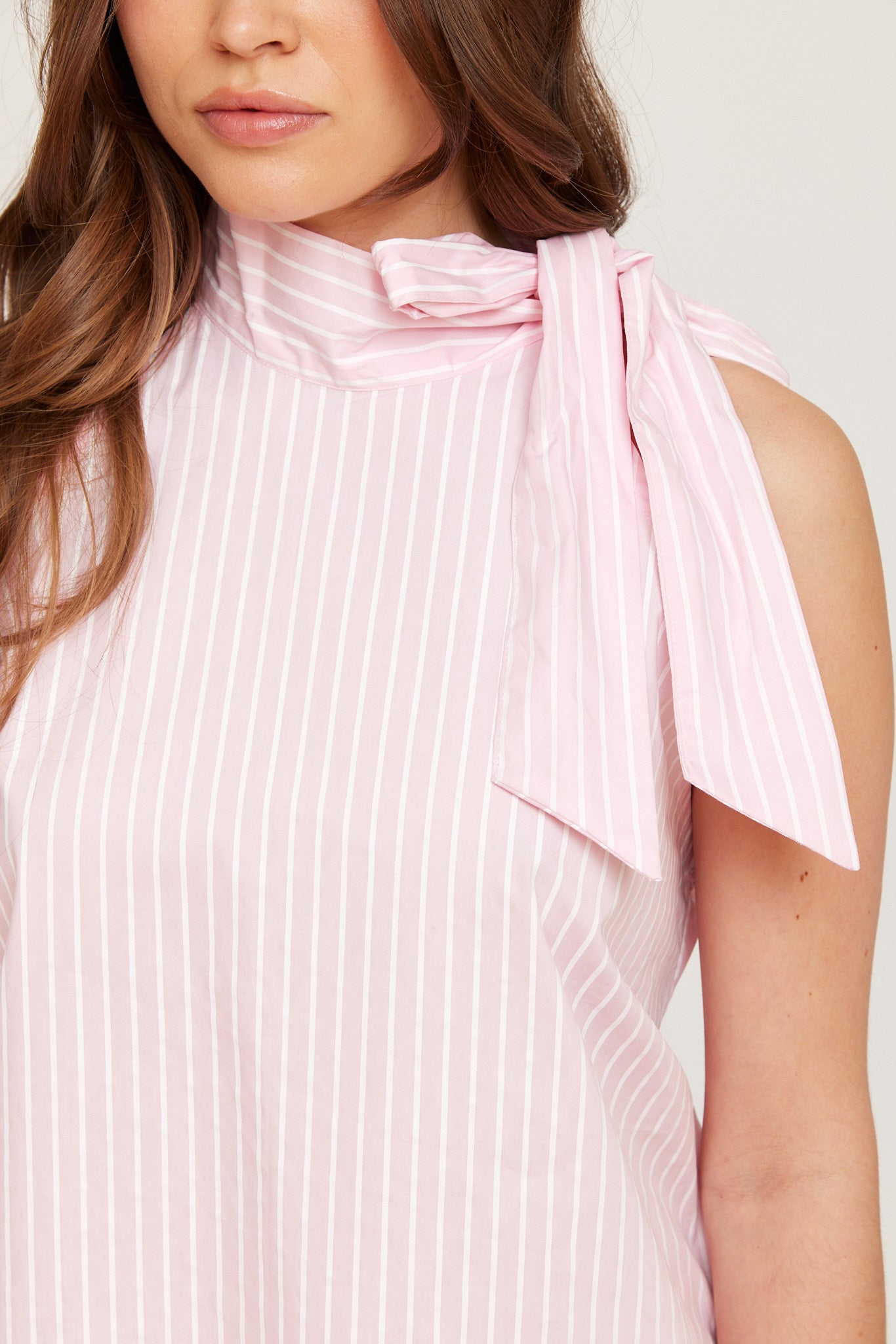 A soft, lightweight sleeveless top with thin vertical stripes, featuring an elegant side-tie detail at the neckline. Clean, feminine, and perfect for warm days or layered looks.
